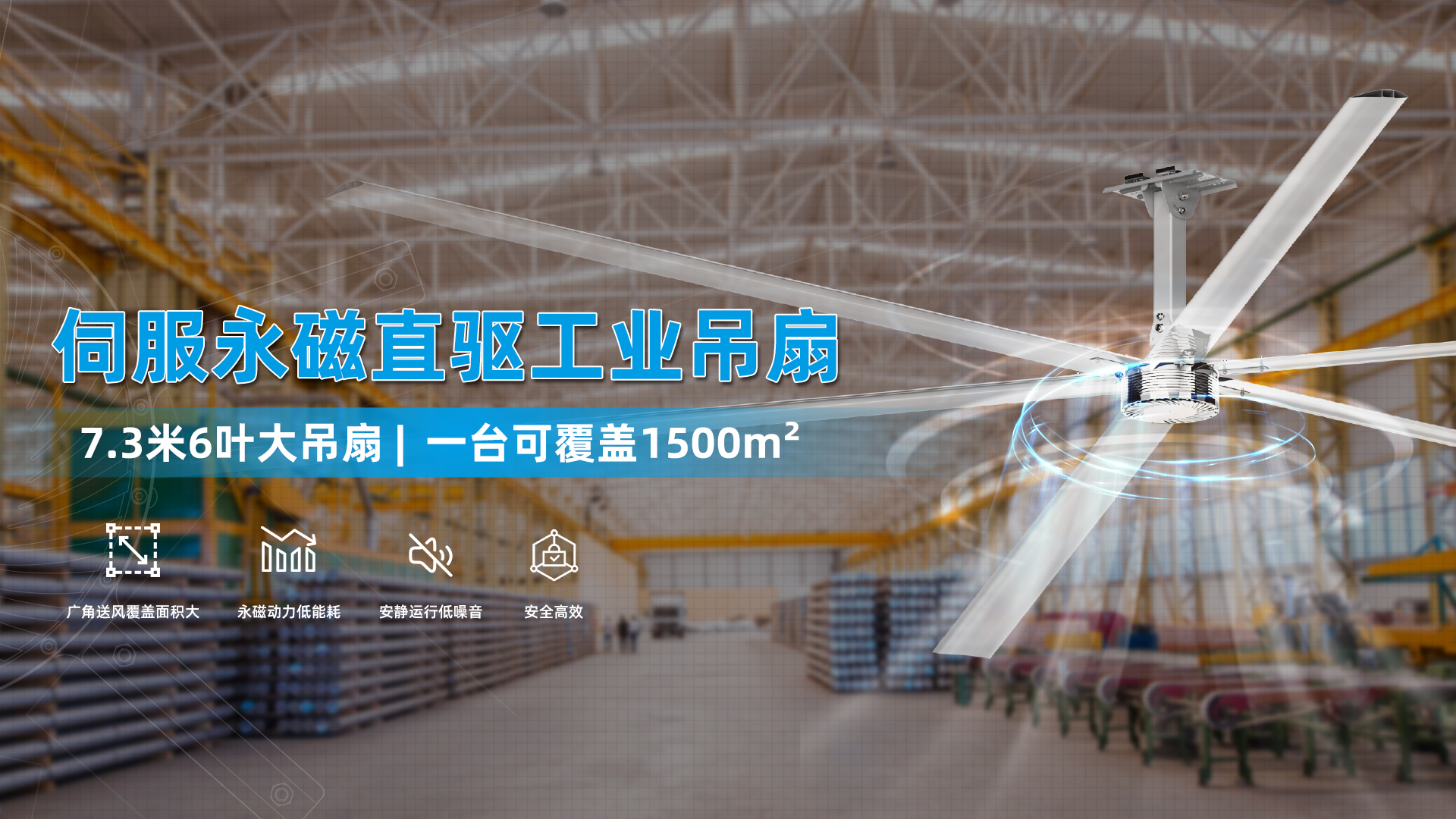 興泰伺服永磁直驅工業大風扇直徑可達7.3米,應用空氣動力學原理和先進工藝制造,風扇僅用1.5Kw的功率就可以驅動大量的空氣,產生超大面積的自然微風系統,起到環境通風和降溫的雙重功能,堪稱高大空間通風降溫的完美解決方案。